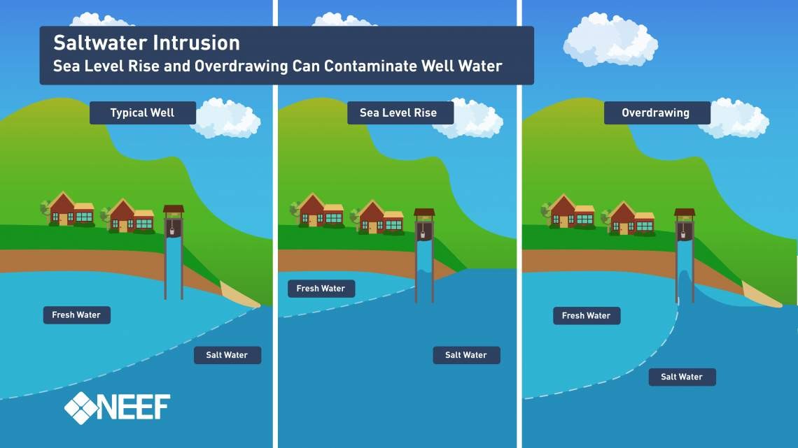 Nước luôn chuyển động xuống dưới, tìm đường cho đến khi ra biển. Điều này cũng xảy ra với nước ngầm. Tại các khu vực ven biển, nơi nước ngầm ngọt từ đất liền gặp nước ngầm mặn sẽ xảy ra một sự giao thoa thú vị. Vì nước mặn hơi đặc hơn nước ngọt nên nó xâm nhập vào các tầng chứa nước, tạo thành một nêm mặn bên dưới nước ngọt. Ranh giới này không cố định, nó thay đổi theo mùa và dao động thủy triều hàng ngày. Nó có nghĩa là vùng xâm nhập của độ mặn hỗn hợp này có thể dịch chuyển vào đất liền trong thời kỳ khô hạn, khi nguồn cung cấp nước ngọt giảm hoặc ra biển trong những tháng mưa.