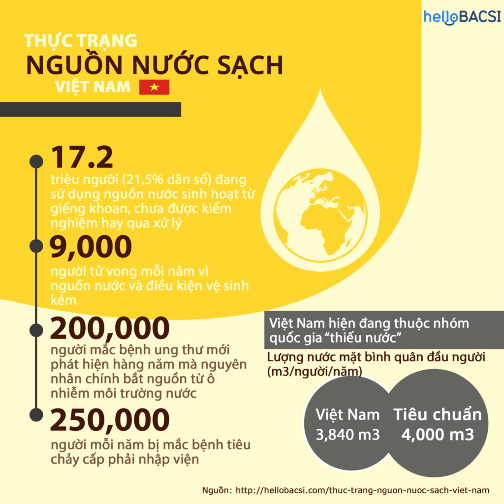 Theo thống kê của Bộ Y tế và Bộ Tài nguyên và Môi trường, trung bình mỗi năm, Việt Nam có khoảng 9.000 người tử vong vì sử dụng nguồn nước ô nhiễm và điều kiện vệ sinh kém.